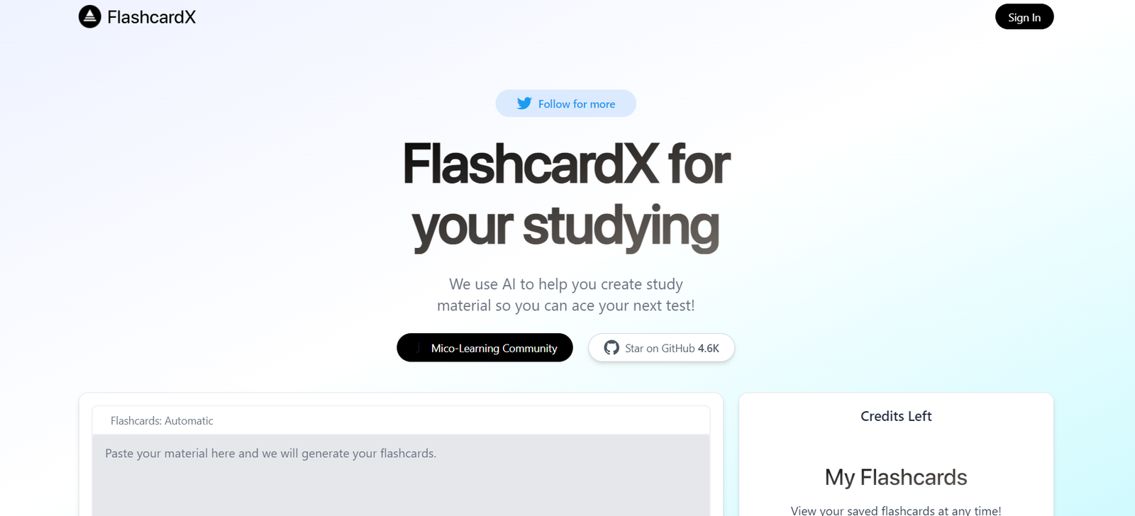 The platform supports micro-learning, a method that breaks down study material into small, manageable pieces, making it easier for users to learn and retain information over time. FlashcardX provides an intuitive interface where users can input text from articles or textbooks, and the AI generates relevant vocabulary words and flashcards automatically.