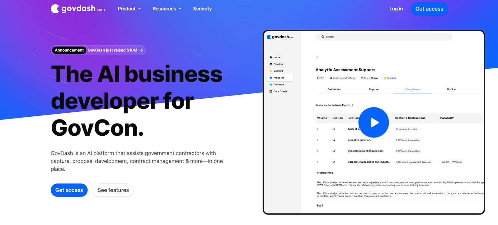 GovDash is an advanced AI platform designed specifically for government contractors. It streamlines the processes of capture, proposal development, and contract management, all within a single interface. By automating and enhancing business development workflows, GovDash helps users to identify opportunities, create compliance matrices, write proposals, and manage contracts efficiently.
