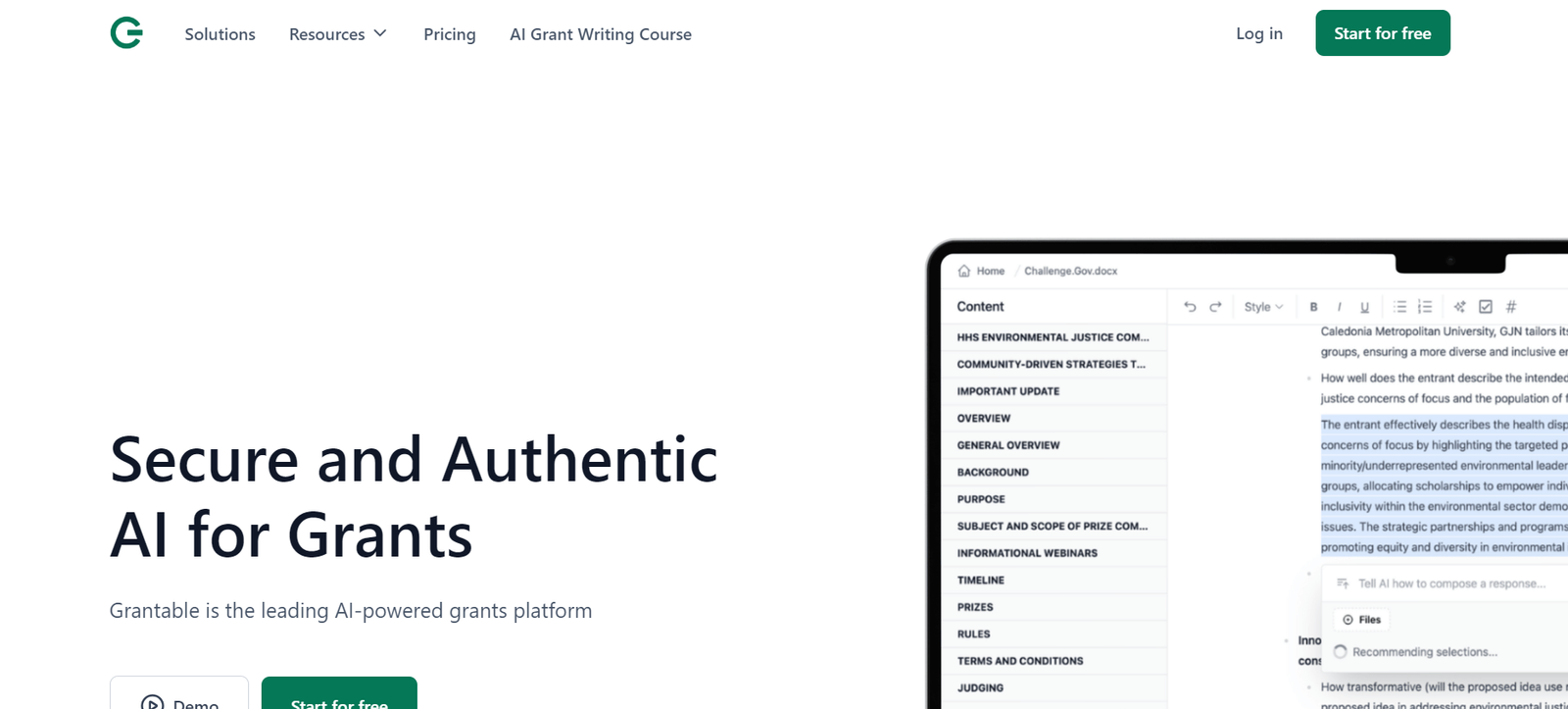 Grantable’s platform offers a secure and private environment for grant writing, ensuring that user data remains confidential and is not used for AI training. The tool provides an intuitive and organized workspace where users can store, search, and reuse content from their past proposals. This dynamic content library is continually updated, making it easier to draft new proposals quickly and effectively.