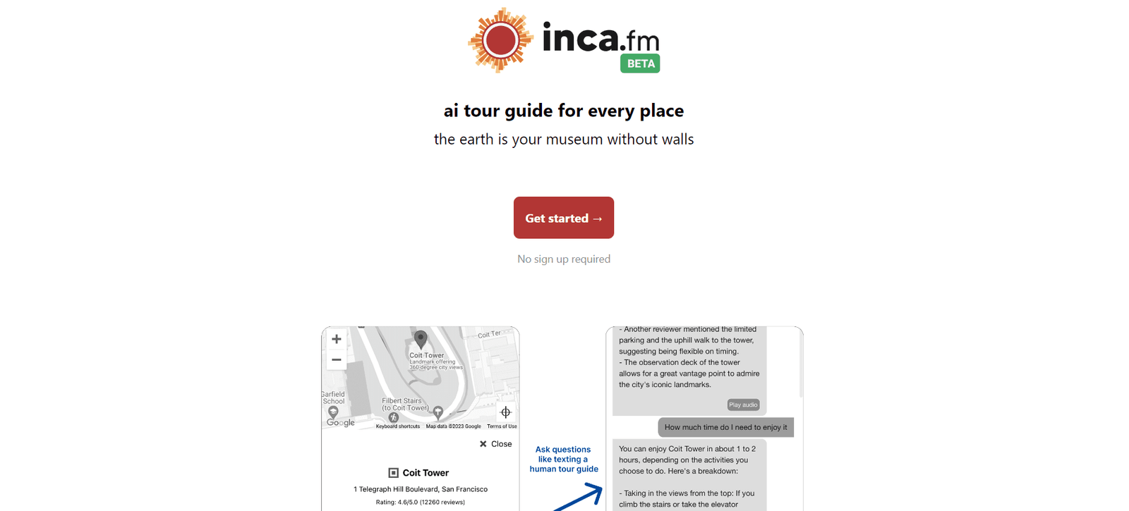 Inca.fm is an innovative AI tool designed to transform the way we experience and explore the world. It serves as a digital tour guide, offering insights and information about various places without the need for physical guides. This tool aims to make every location accessible and educational, turning the Earth into a “museum without walls.”