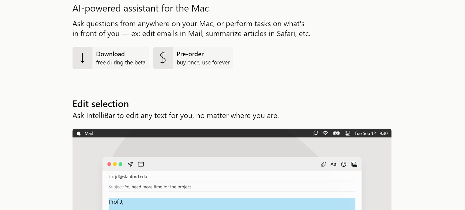 IntelliBar is an AI-powered assistant designed for Mac users, seamlessly integrating with your workflow to perform tasks and answer questions across various applications. Whether you need to edit an email, summarize a web article, or ask about a selected text, IntelliBar is optimized for efficiency. Its keyboard-centric design allows users to execute most commands without leaving the keyboard, enhancing productivity and user experience.