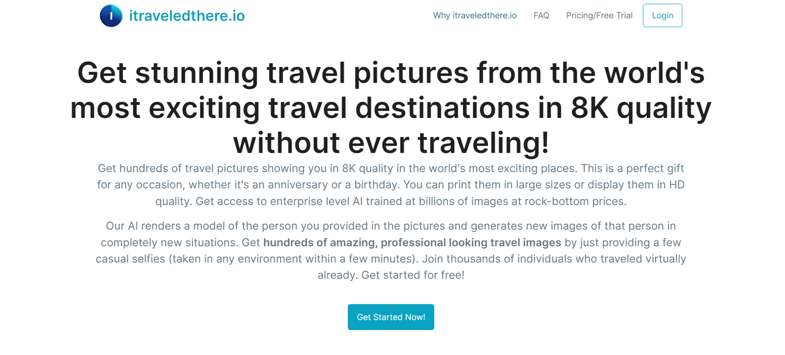 itraveledthere.io is a unique AI-driven tool that generates high-quality travel pictures without the need for actual travel. Users can upload their images, and the AI renders realistic photos of them in various exciting travel destinations in 8K quality. This service is perfect for creating memorable gifts, enhancing social media profiles, or simply enjoying stunning travel images. By using advanced AI technology trained on billions of images, itraveledthere.io provides a cost-effective solution for creating professional-looking travel photos.