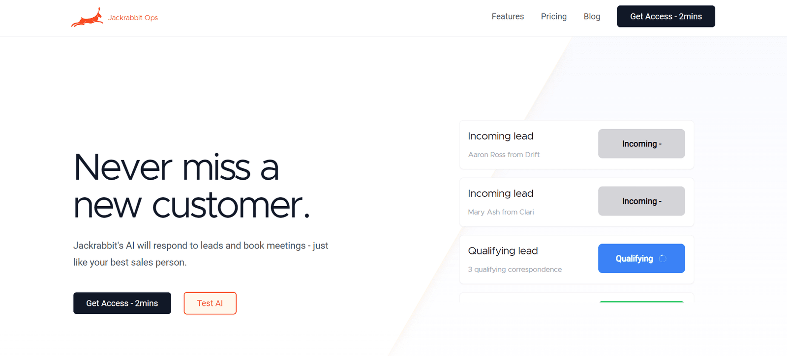 Jackrabbit Ops is an AI-driven tool designed to enhance sales operations by automating lead responses, qualification, and meeting scheduling. By leveraging advanced AI technology, Jackrabbit Ops aims to streamline the sales process, ensuring no potential customer is missed and optimizing the efficiency of sales teams. The platform offers personalized replies to RFQs (Request for Quotes) and evaluates customer intent, providing a comprehensive solution to boost sales and customer engagement.