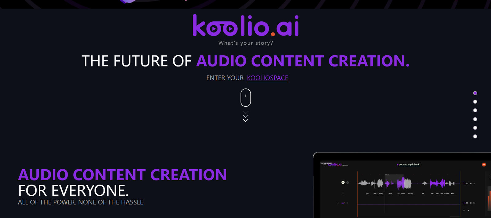 Koolio.ai is an advanced audio content creation tool designed to simplify the process of producing high-quality audio content. It caters to everyone from beginners to professionals, providing a web-based, user-friendly interface that makes creating, editing, and enhancing audio content straightforward and efficient.