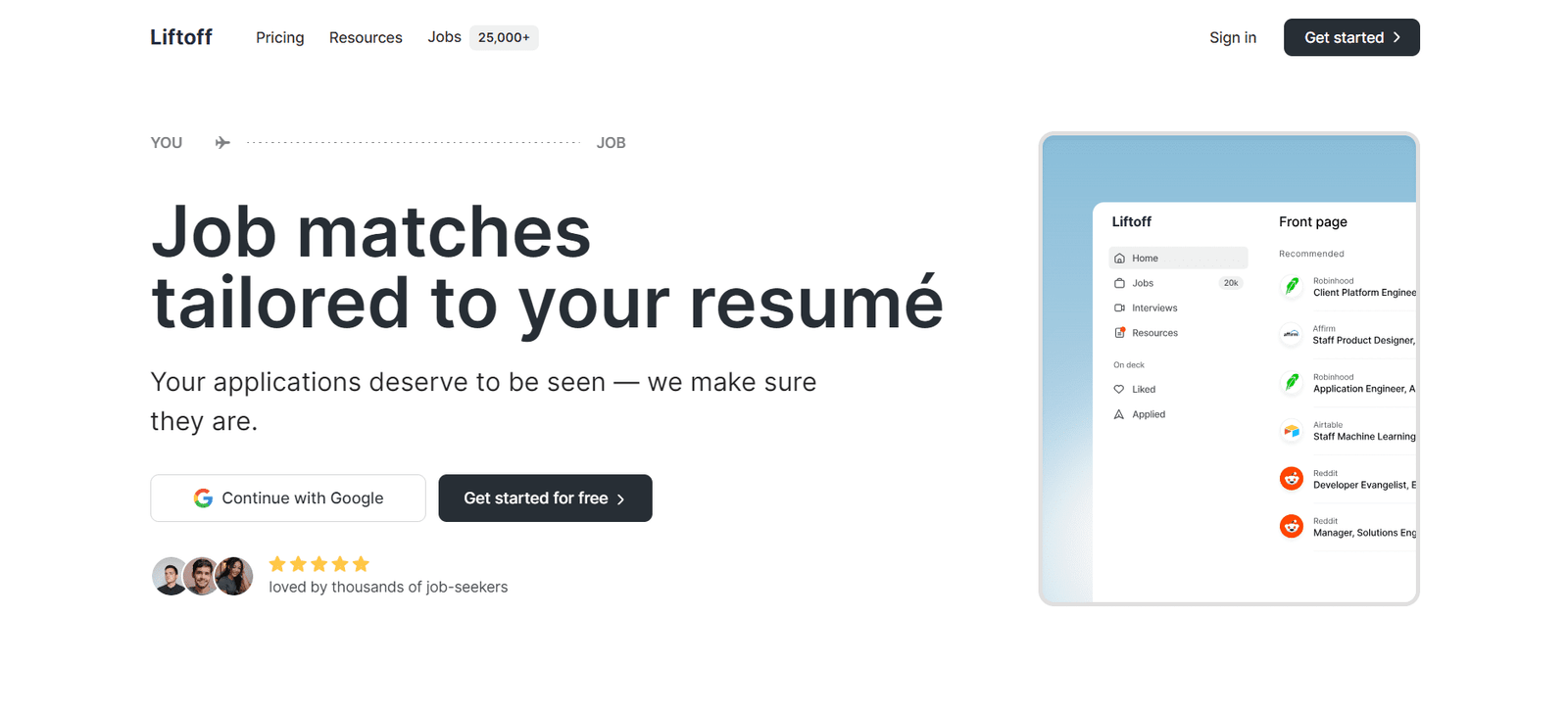 Liftoff is a comprehensive AI-powered job recommendation tool designed to streamline the job search process. It matches job seekers with top companies, providing personalized job recommendations tailored to their resumes. With a focus on making applications visible and improving the chances of getting hired, Liftoff is trusted by thousands of job seekers from renowned organizations such as Shopify, Airbnb, and OpenAI.