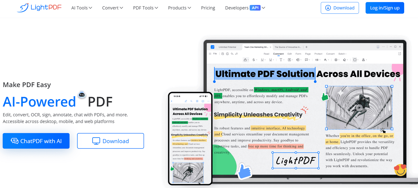 LightPDF is an AI-powered online tool that offers comprehensive services for handling PDF documents. It allows users to edit, convert, sign, annotate, and manage PDFs across desktop, mobile, and web platforms. LightPDF aims to simplify PDF-related tasks by providing user-friendly tools and features that enhance productivity and efficiency.