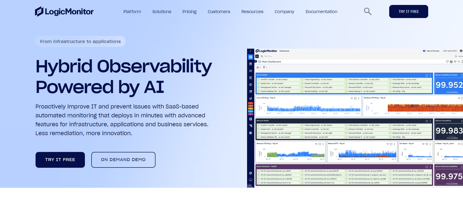 LogicMonitor is a comprehensive SaaS-based observability platform designed to simplify and enhance IT monitoring across hybrid infrastructures. With AI-driven insights, it empowers organizations to proactively manage and optimize their IT environments, reducing downtime and accelerating issue resolution. By providing a unified view through a single pane of glass, LogicMonitor enables seamless integration and real-time monitoring of diverse infrastructures and applications.