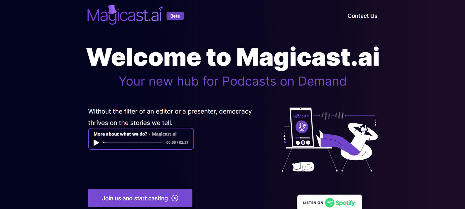 Magicast.ai is an innovative tool designed to create podcasts on demand. Leveraging advanced AI technologies, it converts written content from various sources into accessible audio formats, catering to diverse user needs. From stock market reviews to news digests and educational summaries, Magicast.ai democratizes information by providing clear and comprehensive audio content.