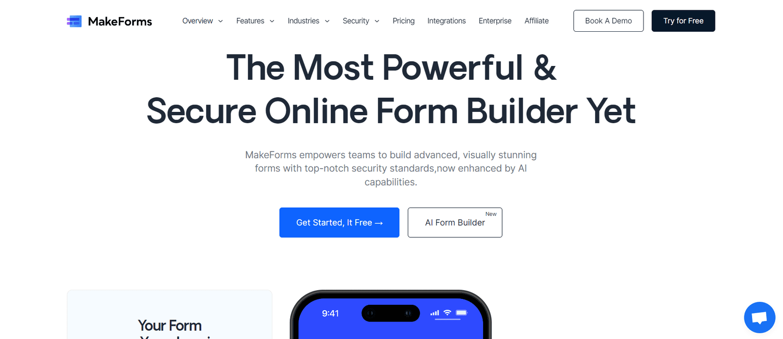 MakeForms is a powerful online form builder designed to help teams create advanced, visually appealing forms with high security standards. The platform is enhanced with AI capabilities, allowing users to build custom forms effortlessly. MakeForms prioritizes security and privacy, ensuring compliance with major frameworks such as HIPAA, SOC2, GDPR, and ISO 27001.