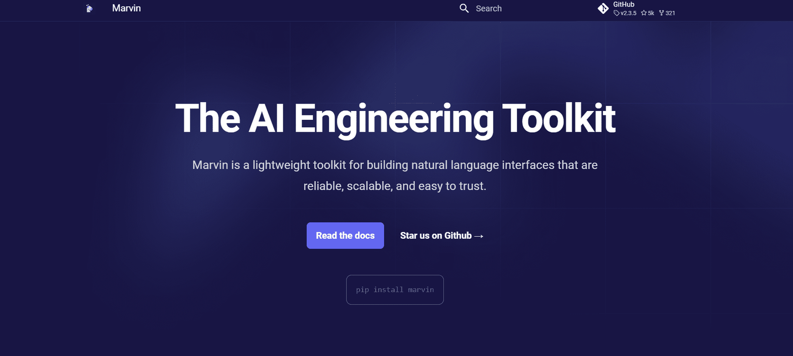 Marvin is a lightweight toolkit designed for building natural language interfaces that are reliable, scalable, and easy to trust. This AI engineering tool aims to simplify the process of creating natural language processing (NLP) applications, making it accessible for developers to integrate advanced AI capabilities into their projects. Whether you are working on chatbots, virtual assistants, or other NLP-driven applications, Marvin provides a streamlined solution to enhance your development process.