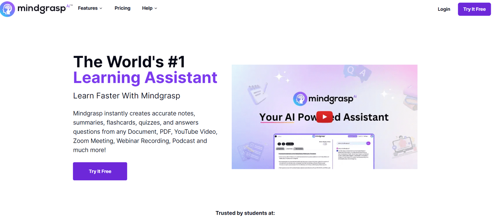 Mindgrasp is a cutting-edge AI-powered learning assistant designed to help users learn faster and more efficiently. It offers a range of tools to create accurate notes, summaries, flashcards, quizzes, and answers to questions from various sources, including documents, PDFs, YouTube videos, Zoom meetings, webinar recordings, and podcasts. With over 20,352 users and growing, Mindgrasp aims to enhance the learning experience by providing instant, reliable information.