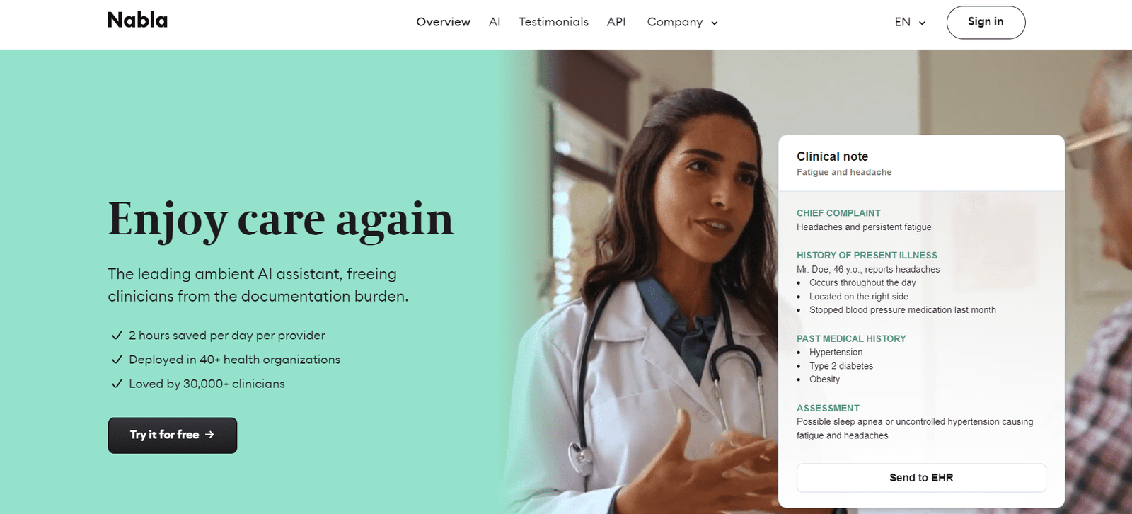 Nabla is an advanced ambient AI assistant designed to streamline clinical documentation, allowing healthcare providers to focus more on patient care. It saves clinicians up to 2 hours per day by automating the documentation process. Deployed in over 40 health organizations and trusted by more than 30,000 clinicians, Nabla is a leading solution in reducing the administrative burden in healthcare settings.