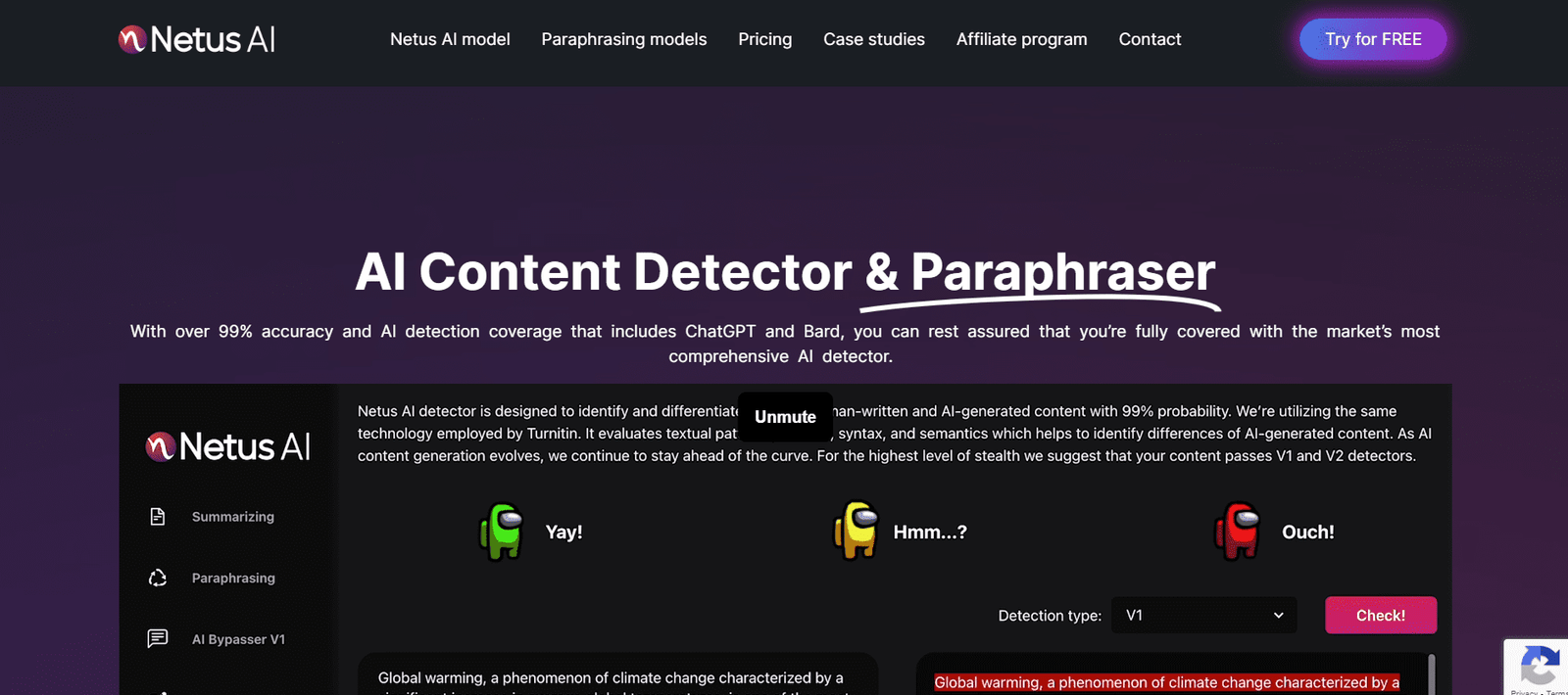 Netus AI offers both paraphrasing and summarization capabilities. Its paraphrasing model can rephrase text to make it undetectable by AI detectors, ensuring the content appears natural and human-like. Additionally, the summarization model helps condense lengthy documents into concise summaries, making it easier for users to extract key information efficiently. These features make Netus AI an essential tool for various content creation tasks.