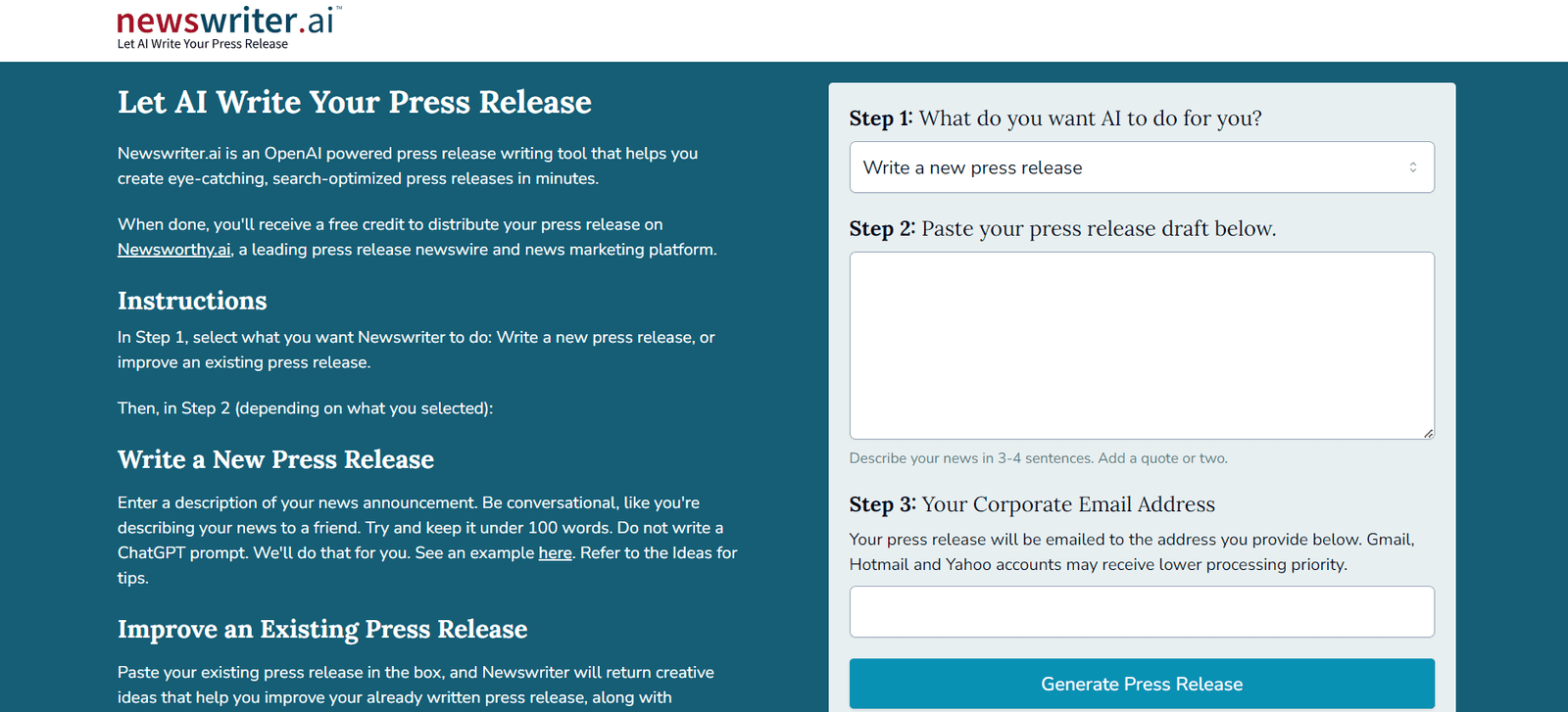 After generating your press release, Newswriter.ai provides a free credit for distribution on Newsworthy.ai, a leading press release newswire and marketing platform. This ensures that your announcement reaches a wide audience, enhancing visibility and engagement.