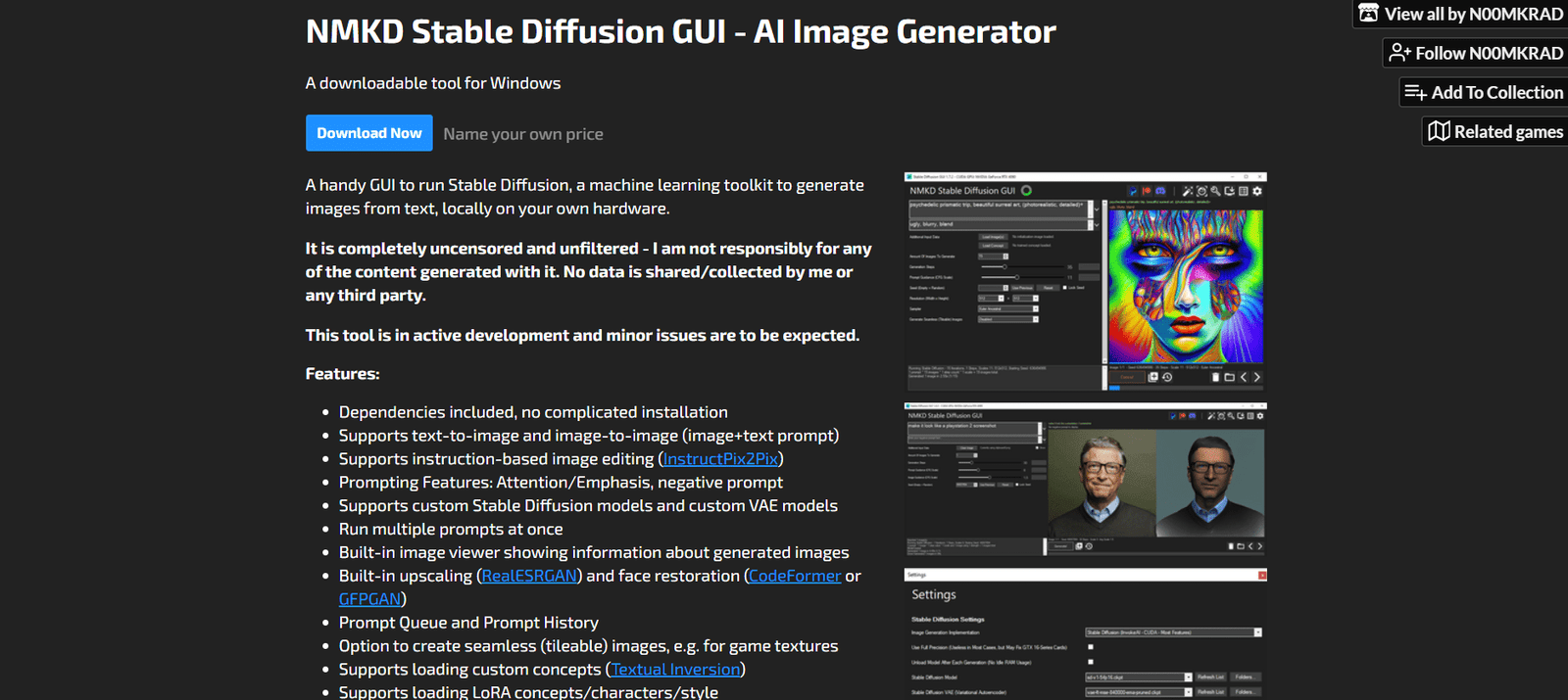 The NMKD Stable Diffusion GUI is a powerful AI image generation tool designed for Windows. This downloadable application allows users to create images from text prompts using their own GPU. It supports various image generation features, including text-to-image and image-to-image conversions, making it a versatile tool for creative projects.