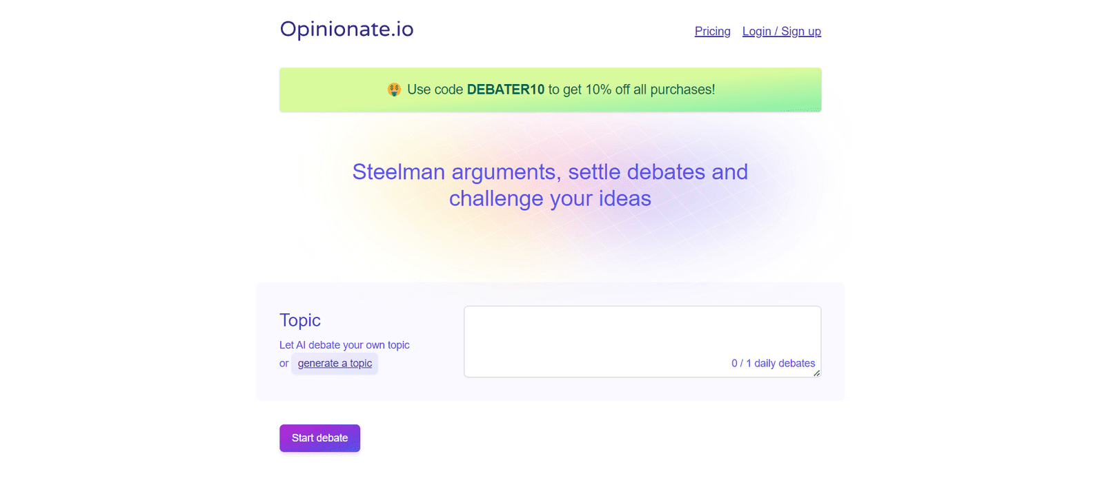 The platform offers a unique approach to argumentation, enabling users to debate their own topics or choose from generated topics. This feature helps users explore different perspectives and understand the strengths and weaknesses of various arguments. Opinionate.io aims to be a valuable resource for individuals looking to improve their critical thinking skills and for organizations seeking to foster a culture of healthy debate.