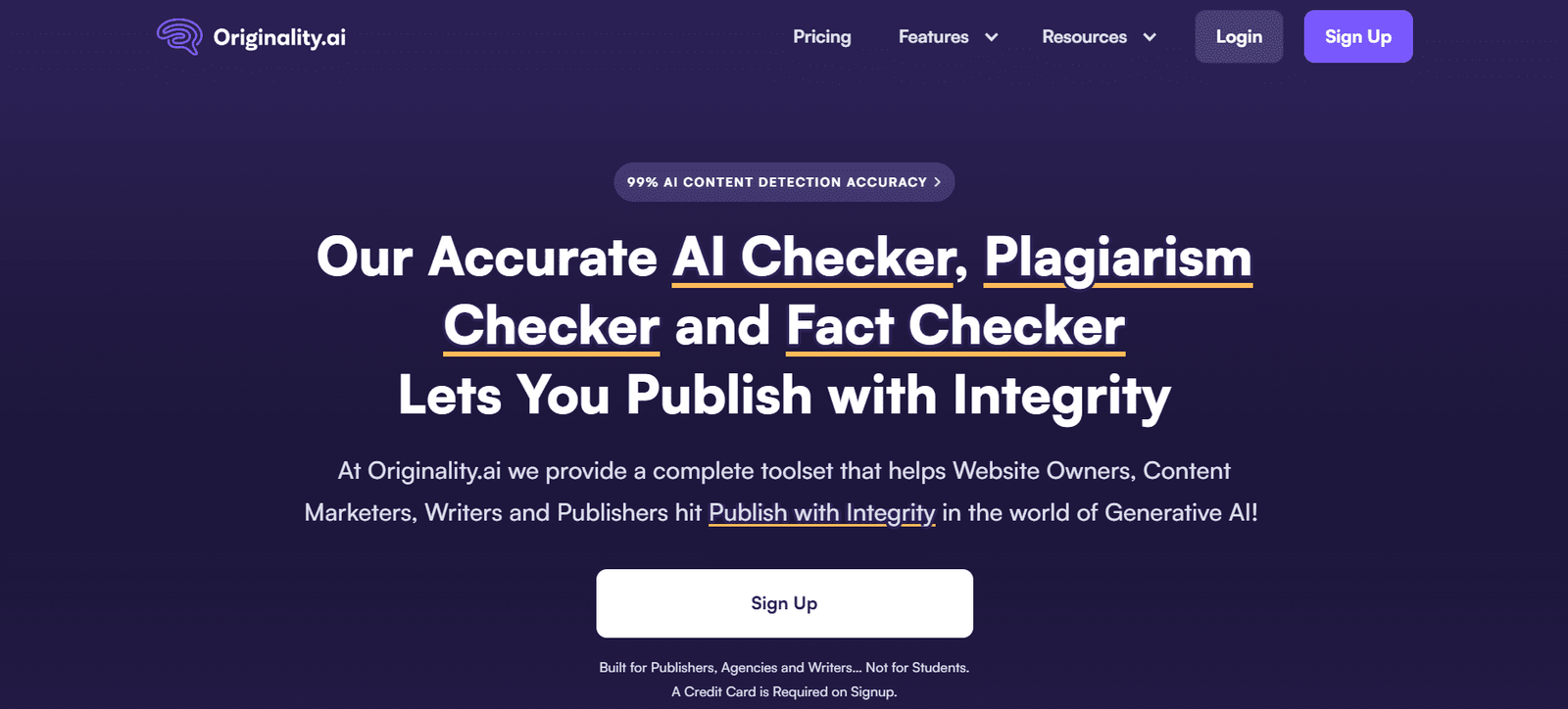 Originality.ai offers a robust toolset designed for web publishers, content marketers, writers, and publishers to ensure content integrity. The platform includes an AI checker, plagiarism checker, fact checker, and readability checker, helping users publish with confidence. It caters primarily to professional environments, such as content marketing agencies and editorial teams, rather than students.