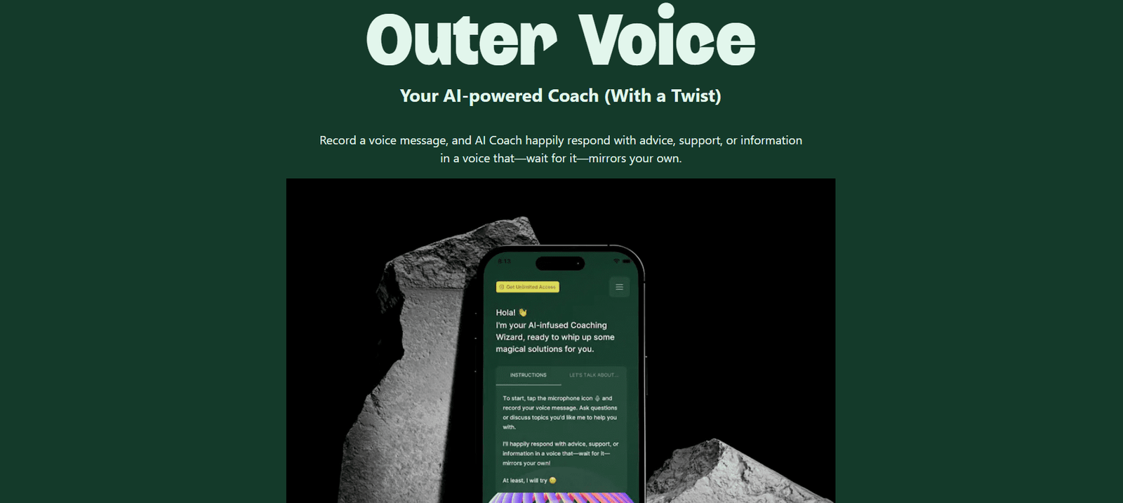 Outer Voice stands out by combining the capabilities of artificial intelligence with the familiarity and comfort of the user’s own voice. It aims to make the coaching experience more relatable and effective by utilizing the power of voice mirroring. This approach not only enhances the user experience but also fosters a deeper connection between the user and the AI.