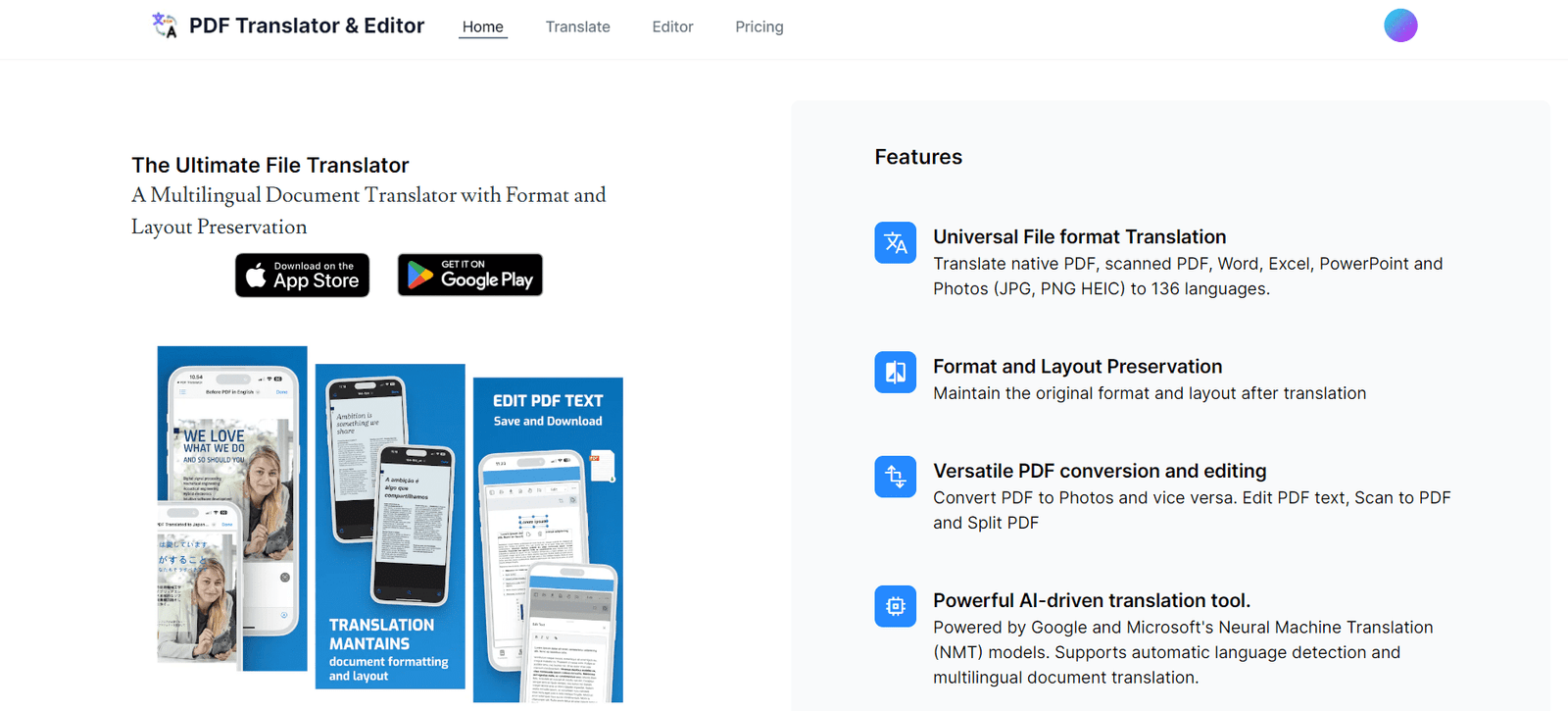 PDF Translator is an advanced multilingual document translator designed to preserve the original format and layout of files during translation. It supports a wide range of file types including native PDF, scanned PDF, Word, Excel, PowerPoint, and image files like JPG and PNG. With the capability to translate into 136 languages, it leverages powerful AI-driven tools from Google and Microsoft’s Neural Machine Translation (NMT) models to provide accurate translations.