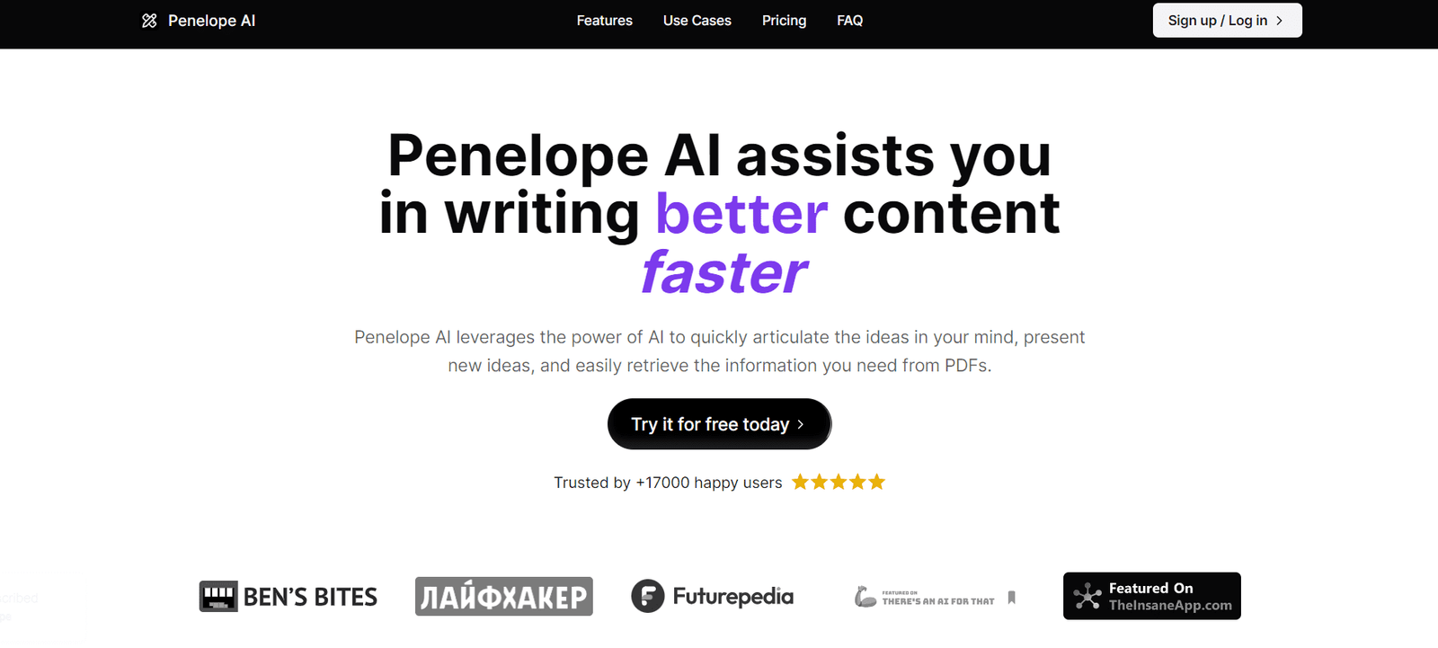 Penelope AI leverages artificial intelligence to enhance writing productivity, offering tools to articulate ideas swiftly, generate new concepts, and extract information from PDFs. Trusted by over 17,000 users, Penelope AI provides a comprehensive suite of AI-driven features that streamline the writing process.