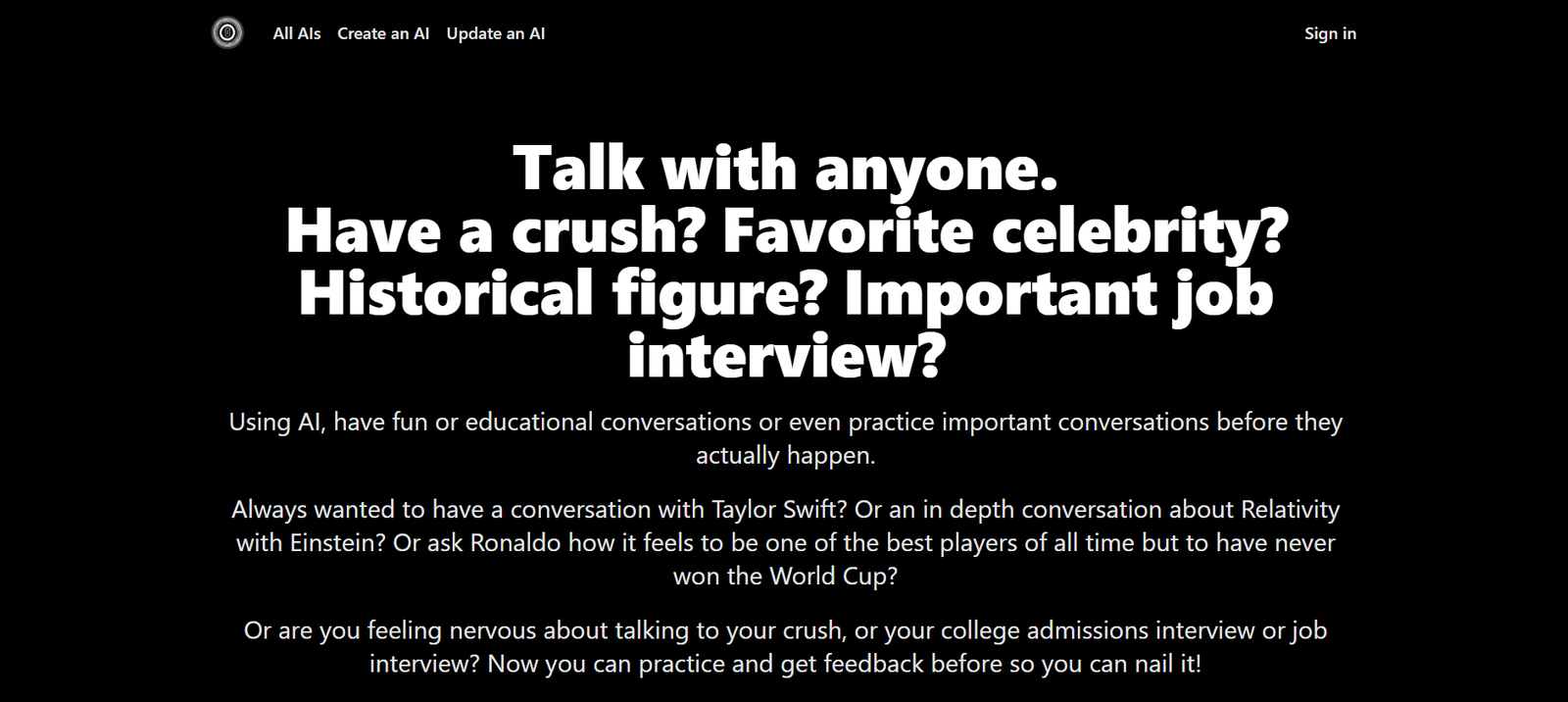 PracticeTalking is an AI-powered tool designed to help users have fun, educational, or practice conversations. It allows users to simulate interactions with famous personalities, like Taylor Swift or Einstein, as well as prepare for important real-life conversations, such as job interviews or talking to a crush. The platform offers pre-trained AI models and the ability to create and share custom AIs with the community.