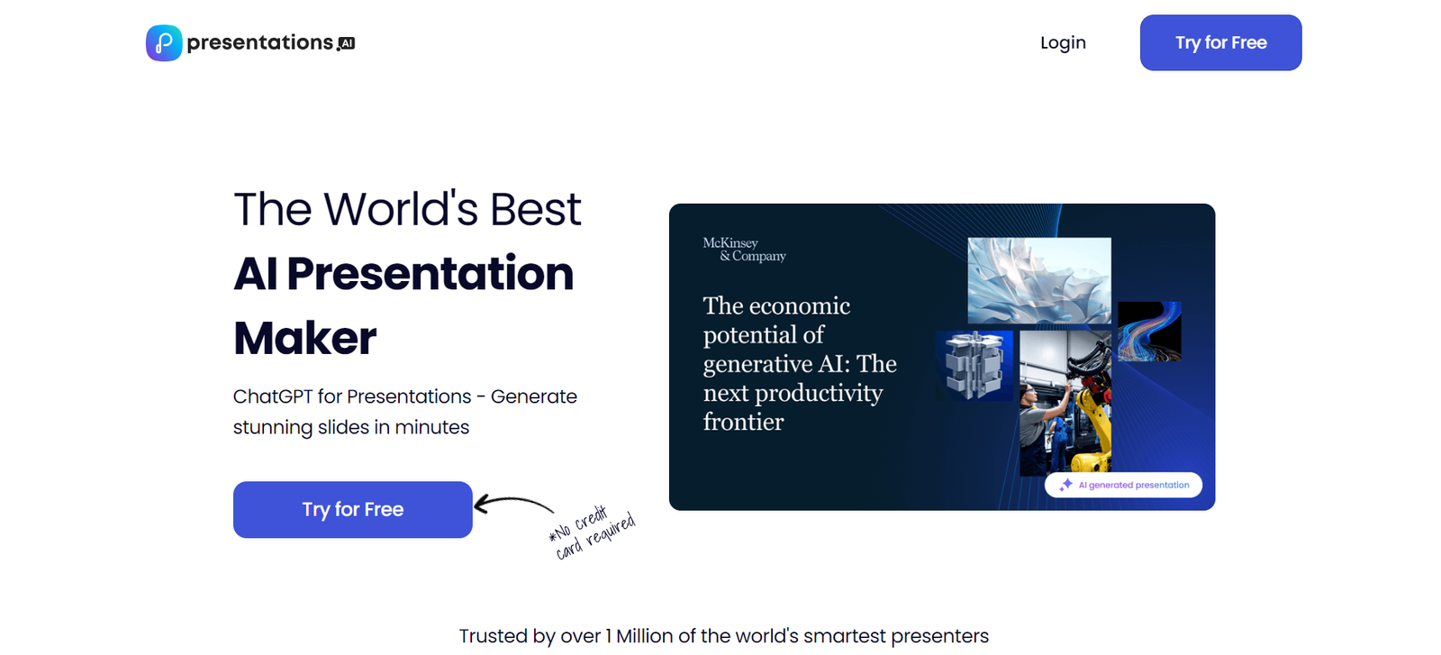 Presentations.ai is a powerful AI-driven presentation maker designed to streamline the creation of professional slides. Trusted by over 1 million users, it significantly reduces the time needed to develop a polished first draft and enhances design quality. With its intuitive interface and intelligent design suggestions, users can effortlessly transform their ideas into engaging presentations.