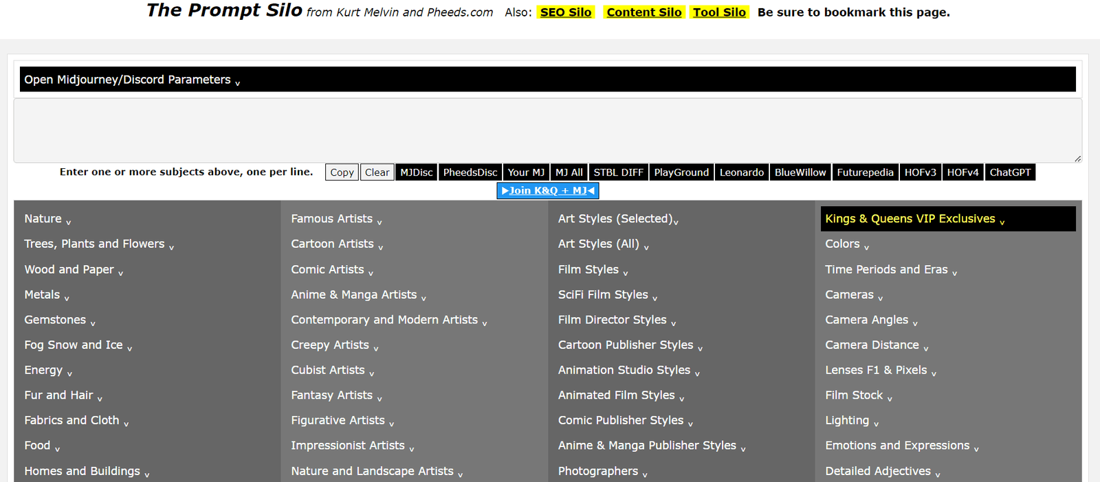 Prompt Silo is a comprehensive tool designed to enhance content creation, particularly for AI-driven projects. Developed by Kurt Melvin and available on Pheeds.com, this tool offers a vast array of prompts and parameters to streamline the creative process. Whether you’re working on SEO, content silos, or AI-generated art, Prompt Silo provides the resources needed to optimize your outputs efficiently.