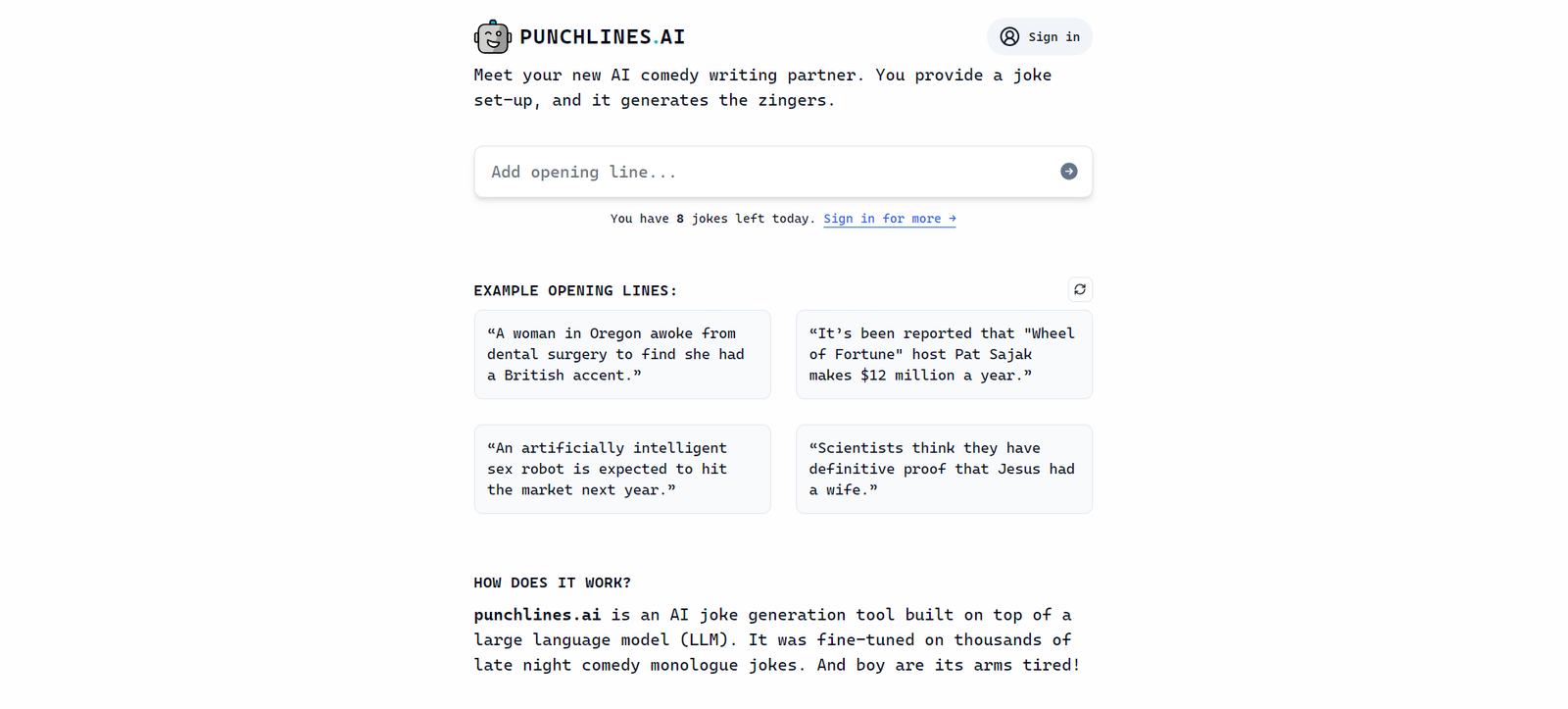 Punchlines.ai is a cutting-edge AI tool designed to generate witty and engaging punchlines for various contexts. Leveraging advanced natural language processing and machine learning algorithms, it assists users in creating humorous content effortlessly. This tool is ideal for comedians, marketers, and social media influencers who aim to enhance their content with clever punchlines.