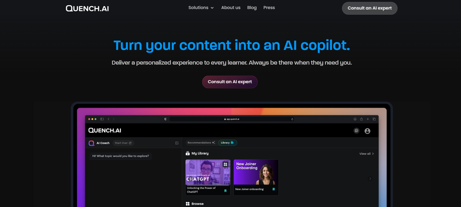 Quench.ai is a powerful AI-driven platform designed to transform static content into an interactive learning experience. It enables organizations to deliver personalized, proactive training by leveraging user data to prioritize content. The tool ensures learners have access to relevant information quickly, enhancing their engagement and knowledge retention.