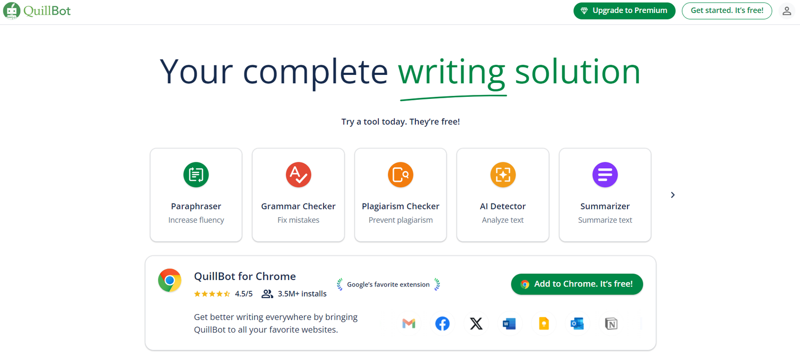 QuillBot is an AI-powered writing assistant designed to help users write effortlessly and efficiently. Its suite of tools includes a paraphraser, grammar checker, plagiarism checker, and more, all aimed at enhancing the quality and clarity of written content. QuillBot supports writers across various platforms, making it a versatile tool for improving writing skills and productivity.