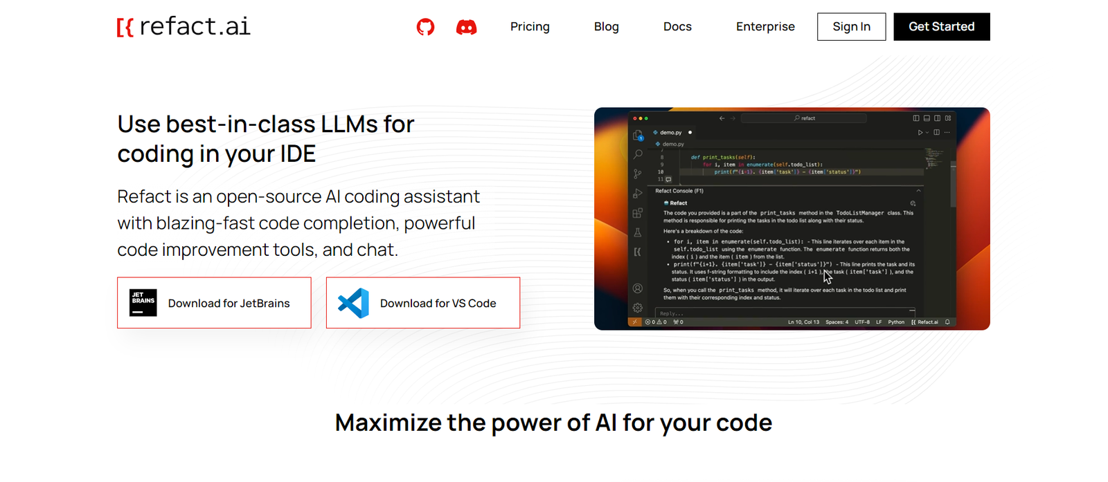 Refact.ai is a powerful AI coding assistant designed to enhance the productivity of developers by providing advanced features such as code completion, refactoring, and interactive chat capabilities. This tool supports multiple code models, including GPT-4, Code Llama, StarCoder, and WizardCoder, allowing users to select the best fit for their specific coding needs.
