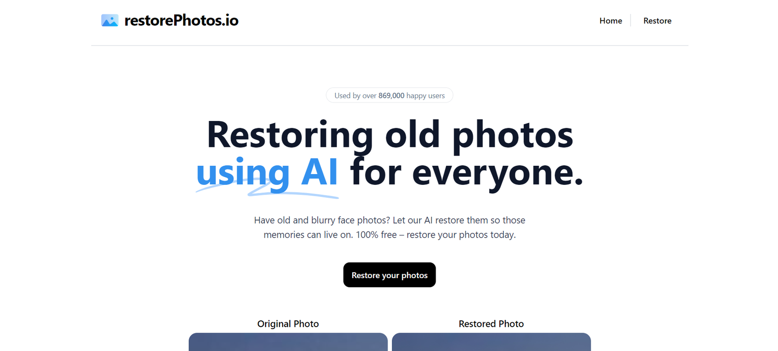 RestorePhotos.io is an AI-powered tool designed to restore old and blurry face photos, allowing cherished memories to remain vibrant. This free service leverages advanced artificial intelligence to enhance image clarity and detail, making it accessible to everyone. With a user base exceeding 869,000, it has proven to be a popular choice for photo restoration enthusiasts.