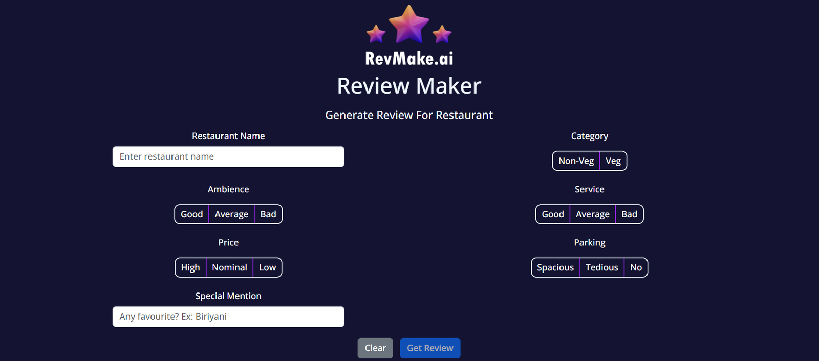 RevMakeAI is an innovative tool designed to generate reviews for various categories such as restaurants, locations, and movies. It leverages advanced artificial intelligence to create detailed and accurate reviews based on user inputs. This tool is ideal for businesses and individuals looking to streamline the process of content creation, ensuring high-quality and consistent output.