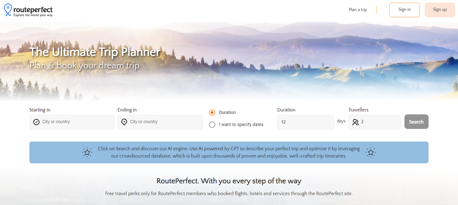 RoutePerfect is an AI-powered trip planning tool that offers personalized itineraries for travelers. With its easy-to-use interface, users can select destinations, dates, and preferred activities to create their ideal journey. By leveraging partnerships with Expedia, Booking.com, and other travel services, RoutePerfect provides comprehensive travel solutions including flights, hotels, and car rentals.