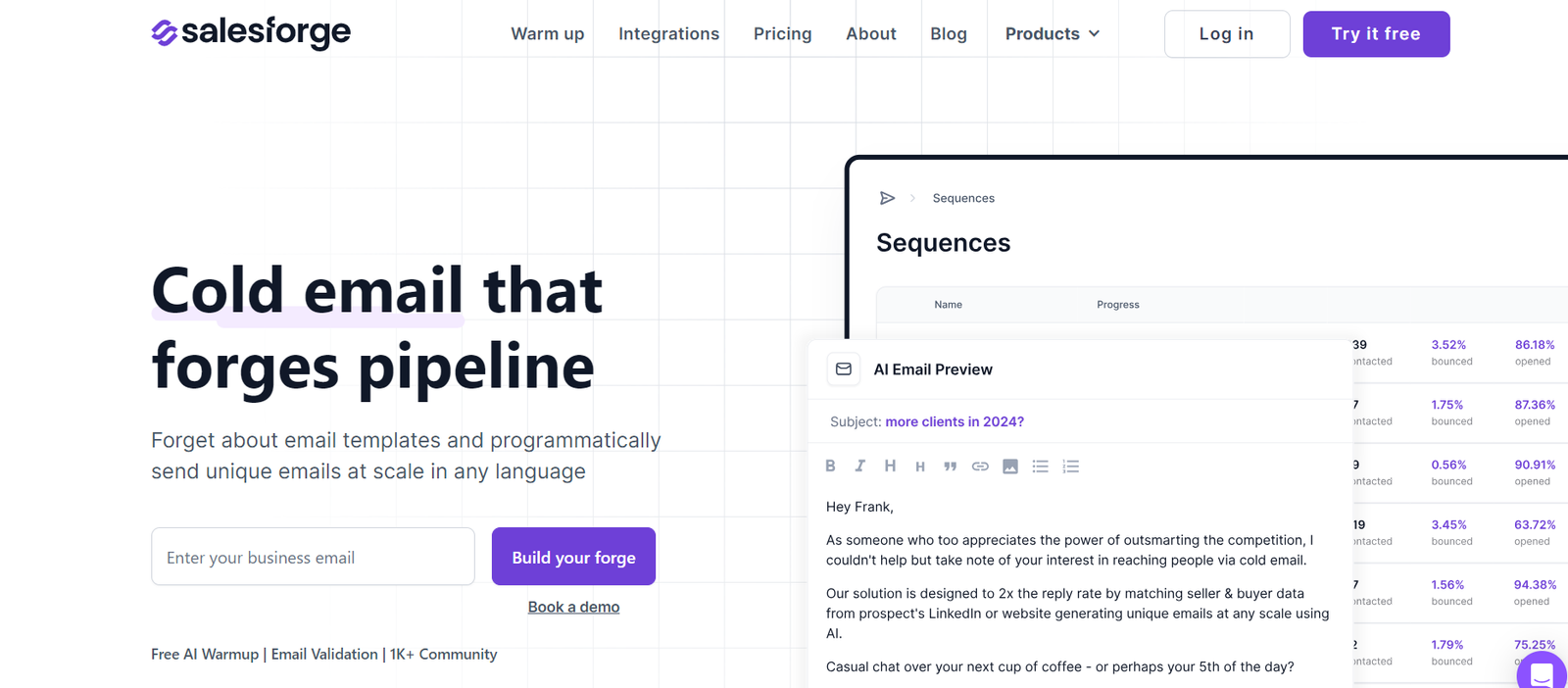 Salesforge is a powerful AI-driven tool designed to revolutionize email outreach by enabling the programmatic sending of unique emails at scale in any language. It simplifies the process of connecting multiple mailboxes, maintaining high deliverability rates, and crafting personalized emails quickly. Salesforge is tailored to help businesses improve their email reply rates and overall outreach efficiency without the need for extensive manual effort.
