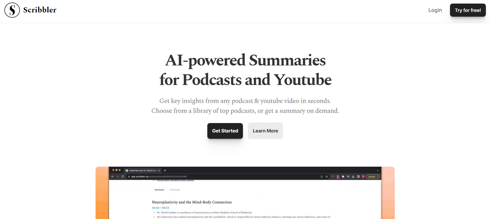 Scribbler is an AI-powered tool designed to provide quick, clear summaries of podcasts and YouTube videos, allowing users to get key insights without spending hours listening. It transforms passive listening into active engagement by offering full transcripts and clickable timestamps. Users can subscribe to receive curated email digests, making it easy to stay updated on essential content.