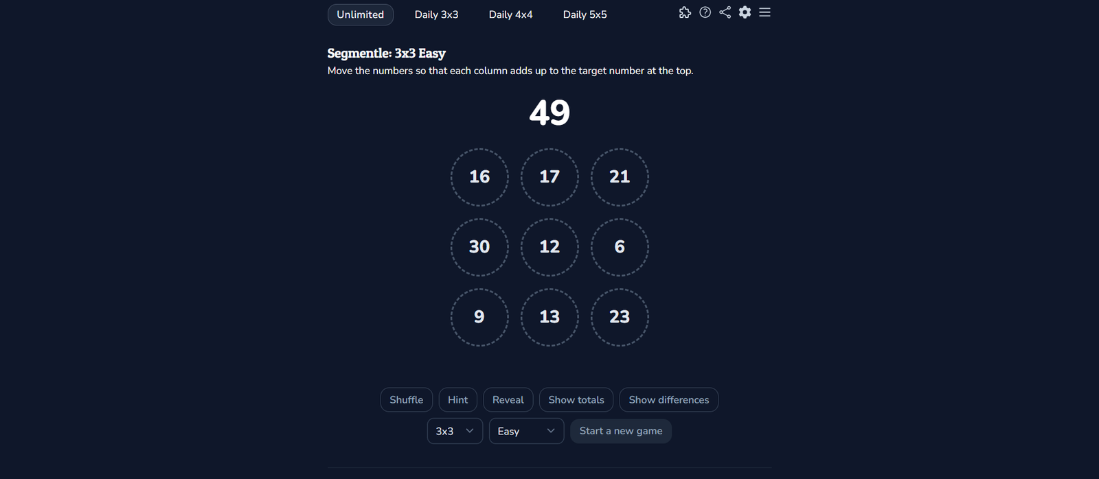 Segmentle is an engaging number puzzle game powered by AI, specifically ChatGPT. The game’s primary objective is to rearrange numbers within a grid so that each column sums up to a specified target number. This daily puzzle provides a stimulating challenge that becomes more complex as the grid size increases. The game encourages logical thinking and problem-solving, making it an excellent tool for mental exercise.