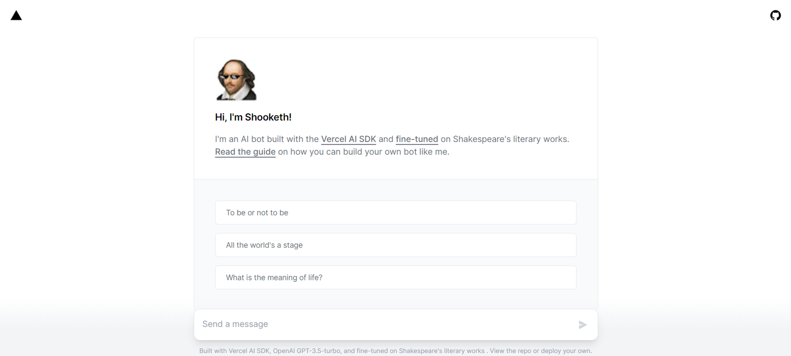 Shooketh is an innovative AI tool designed to generate text inspired by Shakespeare’s literary works. Built using the Vercel AI SDK and OpenAI GPT-3.5-turbo, it provides users with unique and creatively styled responses. Shooketh serves as a fascinating example of how AI can be fine-tuned for specialized content, offering both entertainment and educational value. This AI bot showcases the potential of combining historical literary influences with modern AI technology.