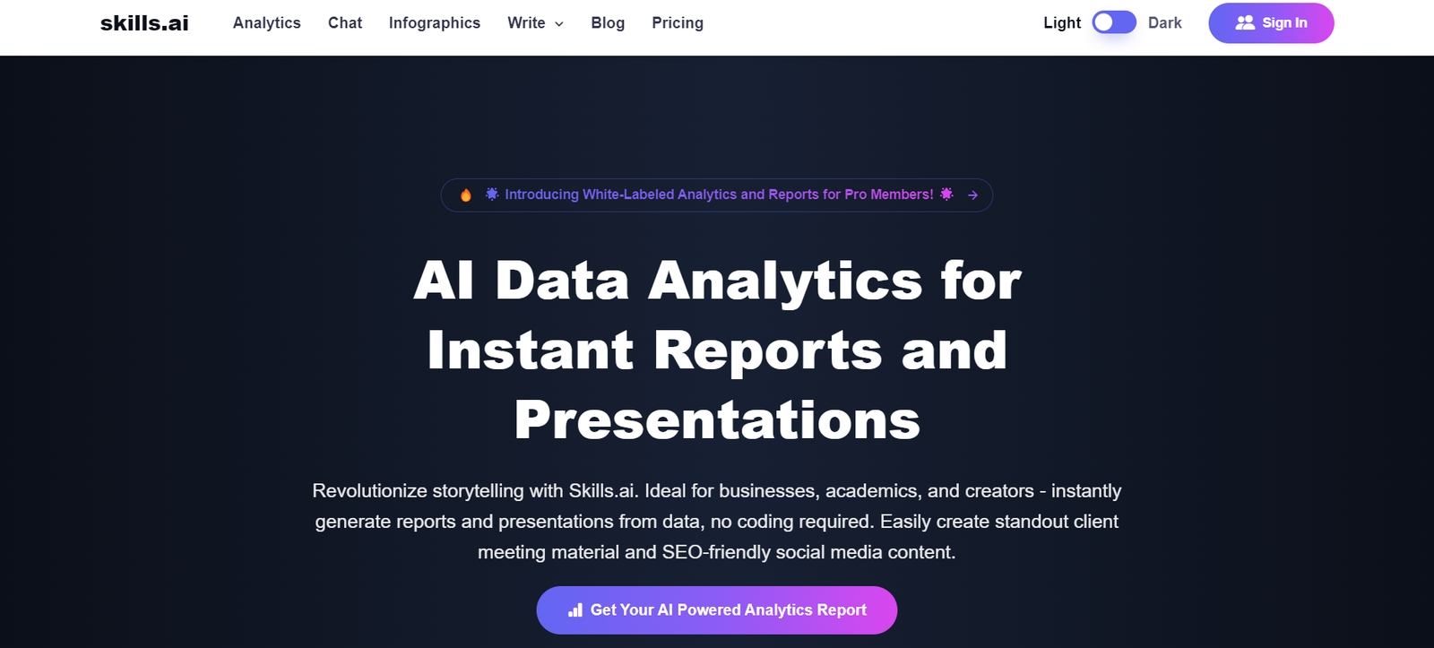 Skills.ai offers an AI-driven data analytics tool that allows users to interact directly with their data through a chat interface. This platform aims to simplify data analysis by providing real-time answers to data-related questions, eliminating the need for support tickets or long email threads. Users can upload their data, ask questions in natural language, and receive instant insights and visualizations, making data analysis more accessible and efficient.