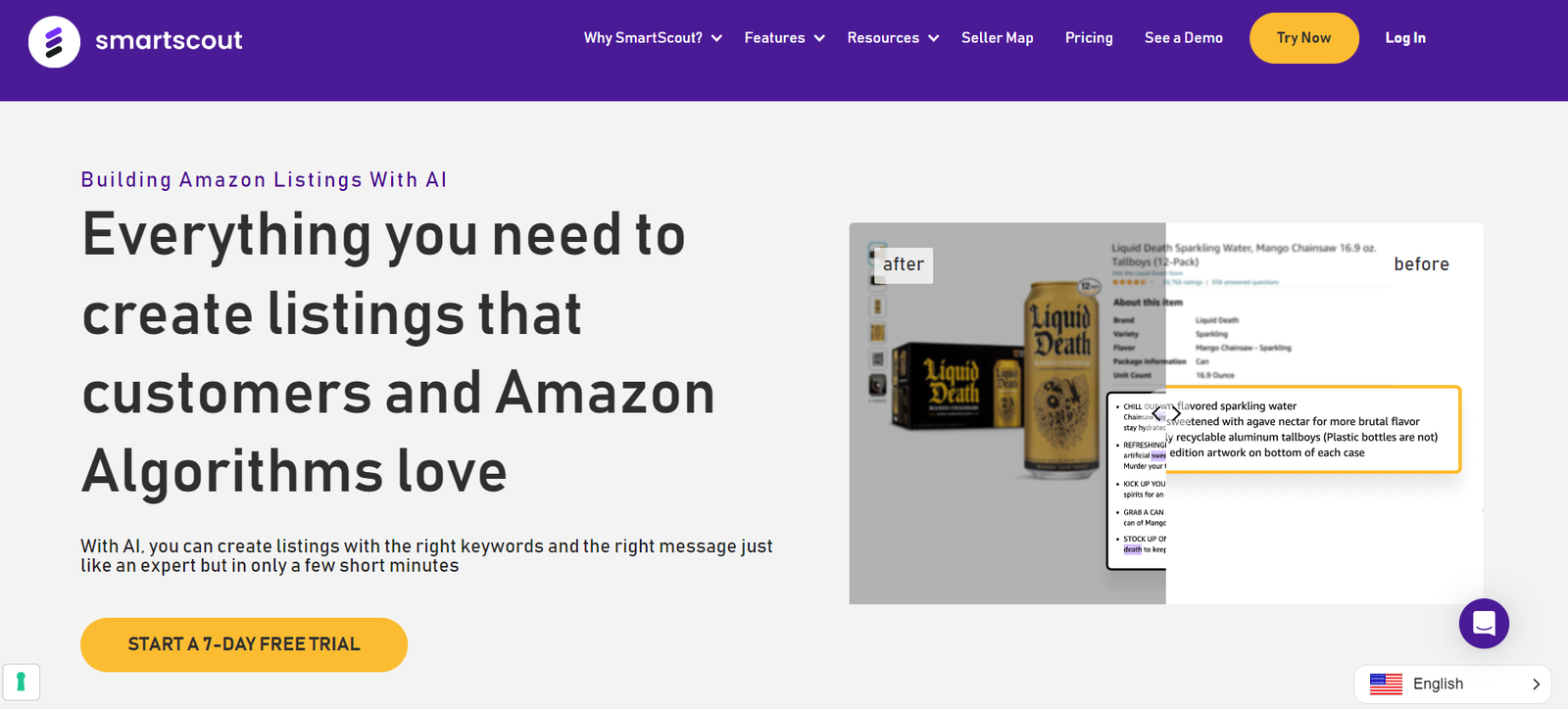 SmartScout’s AI Listing Architect is an innovative tool designed to assist Amazon sellers in creating high-converting product listings quickly and efficiently. By leveraging AI technology, this tool significantly reduces the time and effort required for keyword research and description writing. It uses data directly from the Amazon algorithm to generate SEO-optimized listings, ensuring they rank highly and attract more buyers.