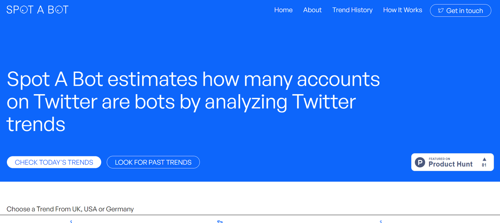 Spot-a-Bot is an AI tool designed to analyze and estimate the number of bot accounts on Twitter by examining trending topics. This tool provides insights into the prevalence of bot activity in various regions, including the UK, USA, and Germany. Due to recent changes in Twitter’s API policy, the tool’s ability to provide daily trend analyses has been impacted.