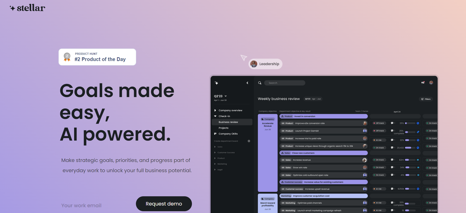 Stellar is an AI-powered platform designed to streamline strategic goal setting, tracking, and progress monitoring. It leverages intelligent goal cascading, automated tracking, and smart prompts to enhance organizational focus and performance. By providing data-driven health summaries, Stellar ensures insightful progress updates and risk management.
