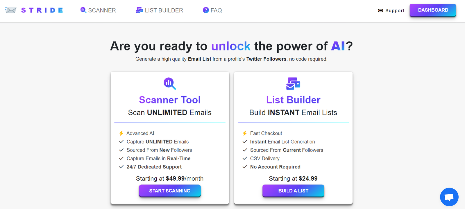 Stride.la is an AI-driven tool designed to generate email leads with high accuracy and relevance. Utilizing advanced AI software, it offers services like retrieving emails of current followers and collecting emails from new followers in real-time. Stride.la ensures the quality and freshness of emails, providing users with reliable and updated contact lists.