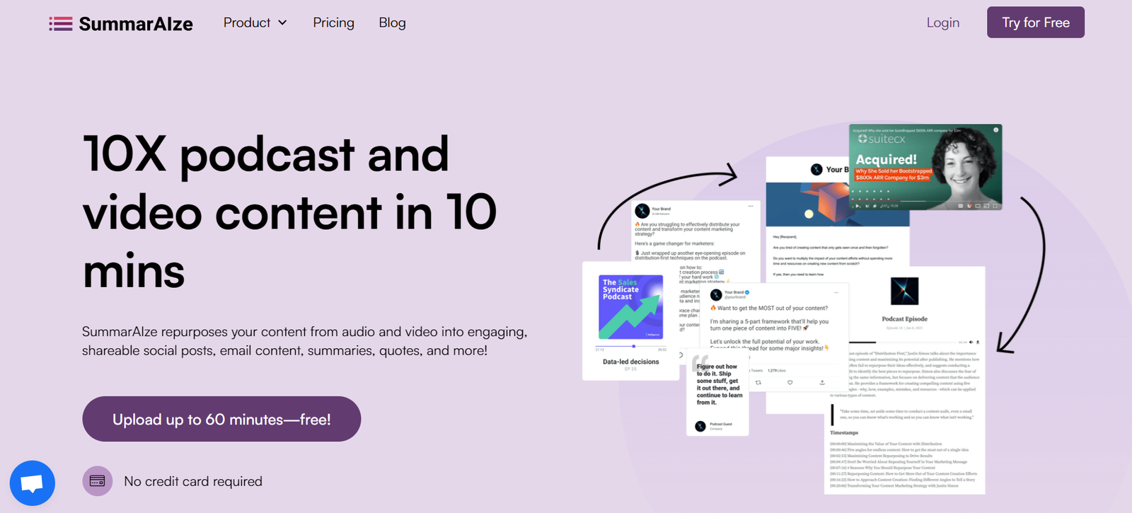 SummarAIze is an AI-driven tool that repurposes content from podcasts, webinars, and other video formats into engaging, shareable social posts, email content, summaries, and more. It allows users to transform audio and video content into various formats effortlessly, significantly enhancing content reach and engagement. Trusted by top podcasters and companies, SummarAIze helps streamline content creation and distribution, ensuring your audience always has fresh, relevant content.