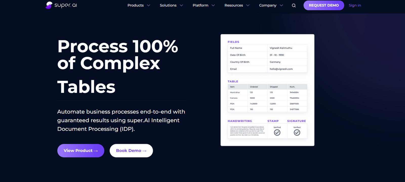 Super.AI is a cutting-edge platform that automates complex document processing using advanced AI models. By leveraging intelligent document processing (IDP), it ensures accurate and efficient data extraction from various document types, such as invoices and PDFs. The platform combines human, AI, and software workers to deliver guaranteed outcomes, making it a reliable solution for businesses looking to streamline their document handling processes.