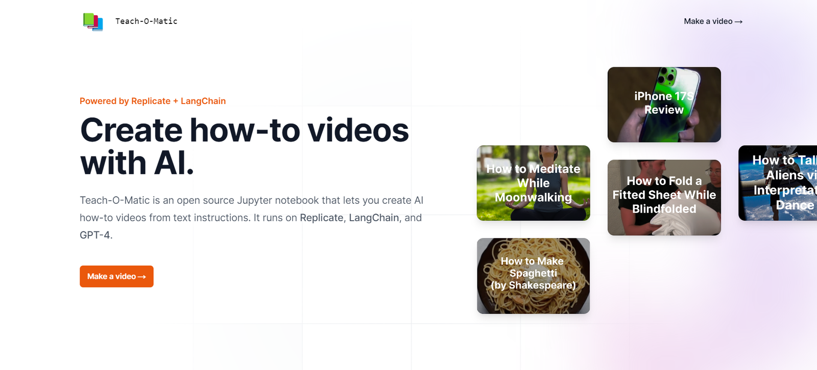 Teach-O-Matic is an AI-driven tool designed to create how-to videos from text instructions. It utilizes a combination of advanced AI technologies such as Replicate, LangChain, and GPT-4 to generate engaging instructional content. This open-source project simplifies video creation by automating scriptwriting, narration, video production, music creation, and cover image design.