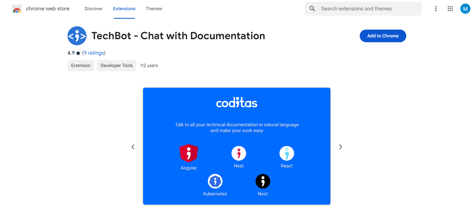 TechBot is an innovative Chrome extension designed to enhance the search experience for developers by utilizing natural language queries. It supports multiple technologies, including Angular, React, Kubernetes, NextJS, and NestJS, allowing users to navigate documentation effortlessly.