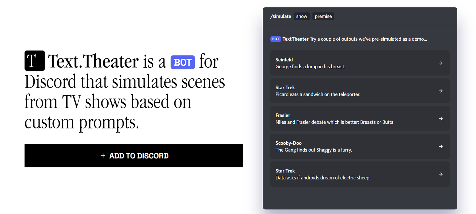 Text.Theater is an AI-powered Discord bot that creates new scenes from users’ favorite TV shows. Using advanced language generation technology, the bot simulates dialogue between characters, generating unique and engaging scenes. Users can easily interact with the bot through specific commands in Discord, providing a seamless and fun experience.