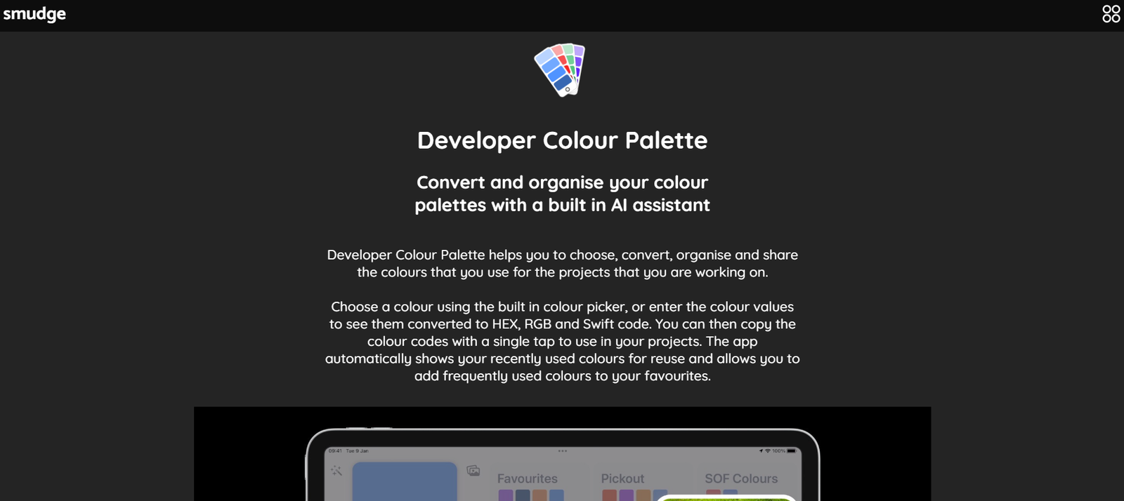 The Developer Colour Palette app by Smudge is designed to help developers choose, convert, organize, and share color palettes for their projects. This app features a built-in AI assistant that enhances color management capabilities. It supports multiple platforms, including iPhone, iPad, and Mac, ensuring that your color palettes are accessible across all your Apple devices.