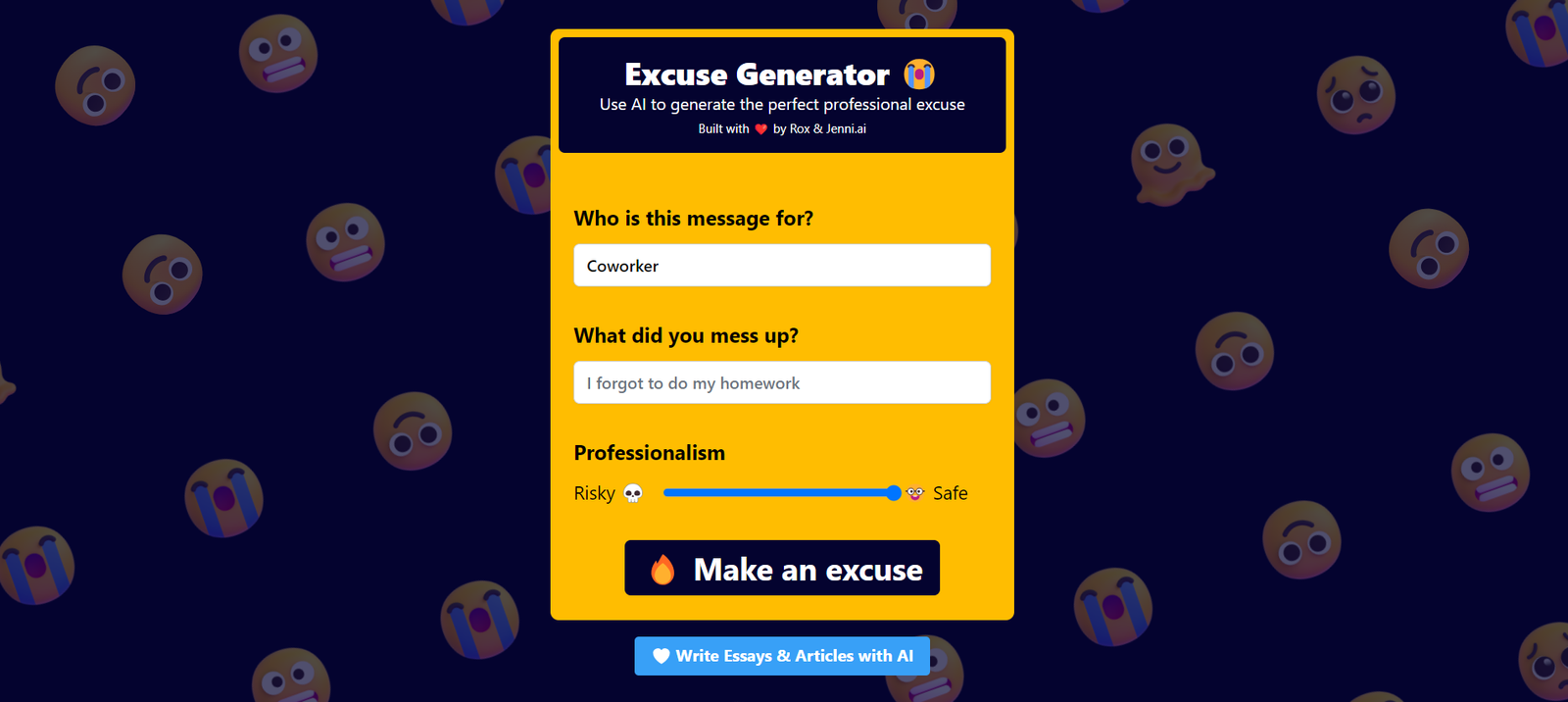 Excuses.ai is an innovative AI tool designed to help users craft the perfect professional excuses. Whether you’re running late, need to reschedule, or have a sudden emergency, Excuses.ai provides well-thought-out and plausible reasons tailored to your specific needs. This tool leverages advanced AI algorithms to ensure that every excuse sounds natural and convincing.